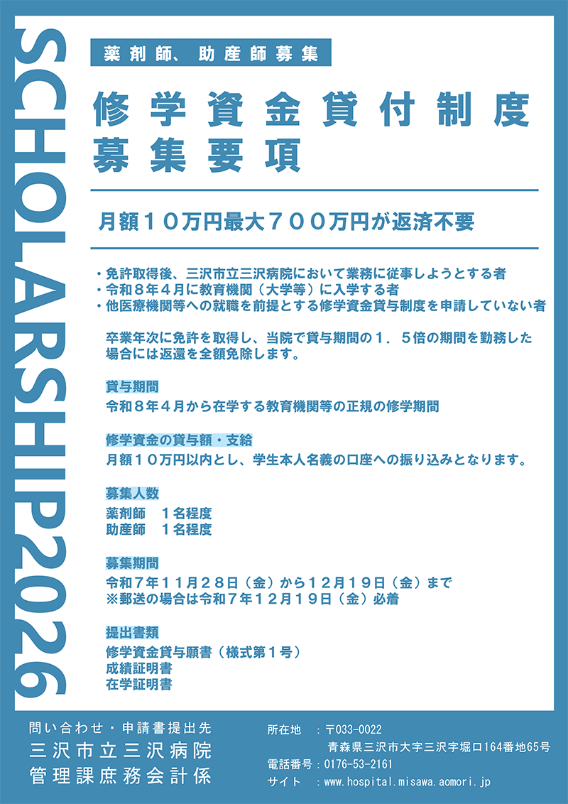 薬剤師または助産師免許取得後、三沢市立三沢病院でその業務に従事しようとする方で、令和8年4月に教育機関等(大学等)に入学を予定する方